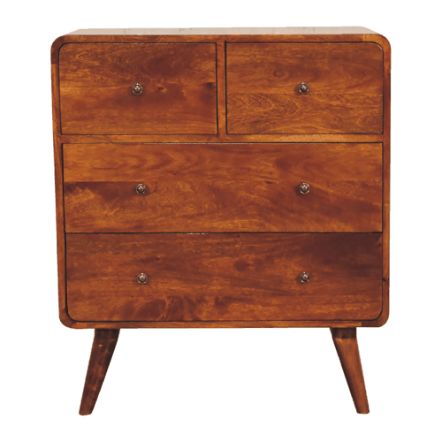 Nestled within the elegant contours of 100% solid mango wood, this curved chest pervades a rich chestnut hue that exudes a sense of depth and warmth. With a quartet of harmoniously crafted Nordic-style legs anchoring its presence, the chest stands proudly, enlivening any room with its distinctive charm. The quartet of drawers, graduated in size, are elegantly affixed with shiny accent knobs that not only serve as a gleaming contrast to the wood’s rich tone but also ensure smooth operability—a subtle yet significant design detail that enhances user interaction and experience daily.