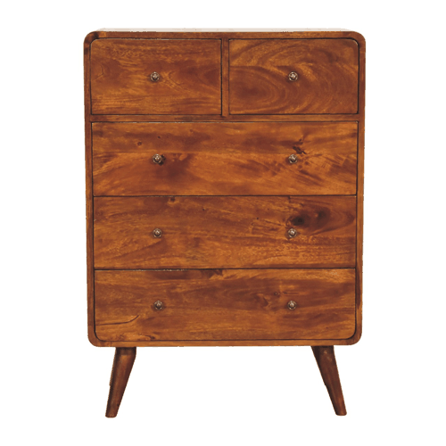 Discover the perfect blend of modern aesthetics and practical design with the 2 over 3 Curved Chestnut Chest, a marquee addition to your living space that encapsulates the essence of contemporary sophistication combined with unrivaled functionality. Crafted with meticulous attention to detail, this chest of drawers stands as a beacon of style in the realm of home furnishings, offering a sleek curved form that is both visually appealing and user-friendly, with ample storage space for all your essentials.