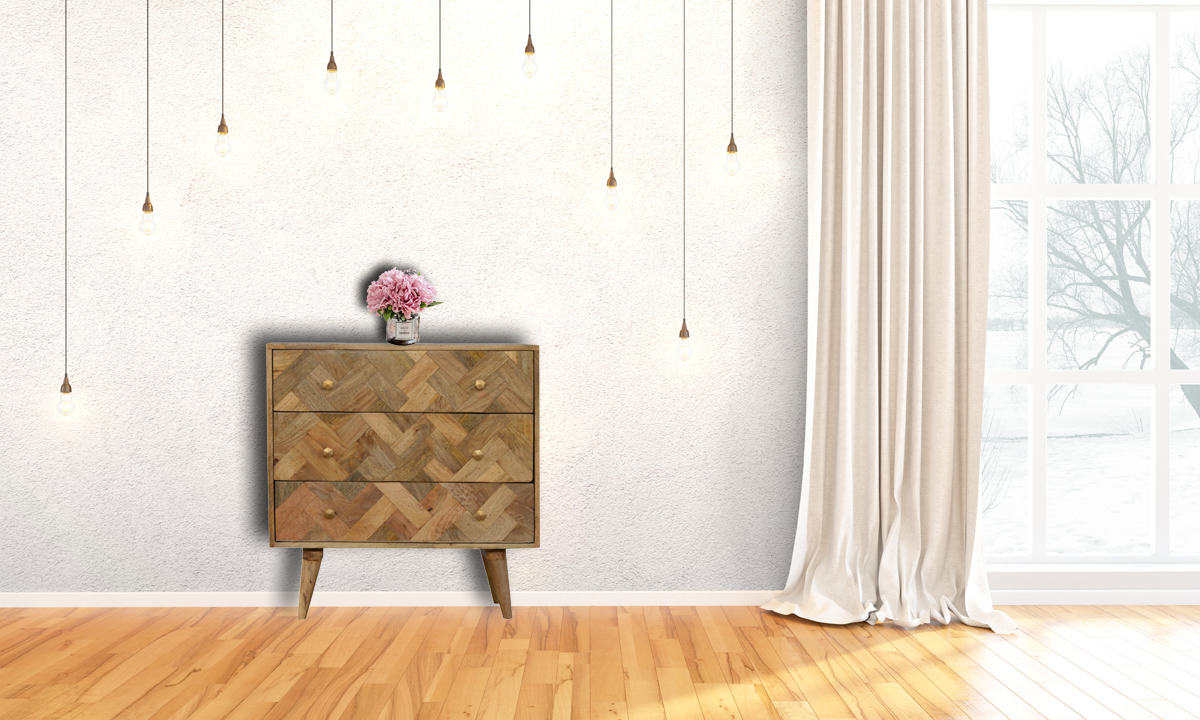 Versatility and Style: The 3 Drawer Zig-Zag Patterned Patchwork Chest is designed to adapt to various interior styles. Whether your home décor leans towards a minimalist modern aesthetic, a cozy rustic feel, or an eclectic mix, this chest complements and enhances the surrounding environment. The intricate zig-zag design adds visual interest and texture, creating a focal point in any room it occupies.
