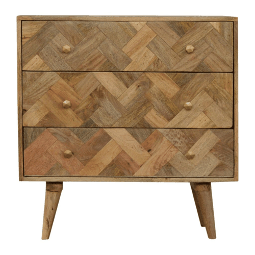 The most striking feature of this chest is its unique zig-zag patchwork design on the drawer fronts. Each piece of wood is carefully selected and arranged to create an eye-catching pattern that showcases different shades of wood. This intricate design imparts a sense of artistic flair, making each chest a distinct piece of furniture that stands out.