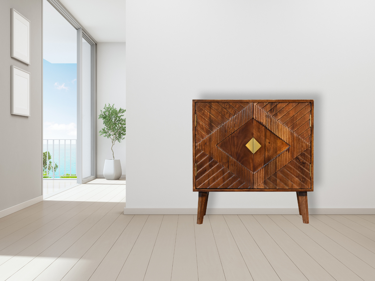 Fashioned with meticulous care, this cabinet is sculpted from 100% solid mango wood, renowned for its durable nature and the striking richness of its chestnut finish. The fine-quality wood is sustainably sourced, reflecting our commitment to environmentally responsible practices. The Alma Cabinet’s distinctive ridged surface is not only a visual feast but offers a tactile experience reserved for furniture of this caliber. Surrounding this textured marvel is a brass inlay diamond that adds a touch of opulence to the cabinet’s humble wooden charm, creating a harmonious blend of luxury and natural beauty.