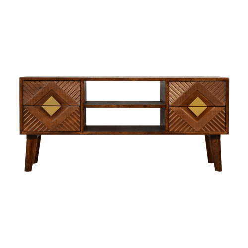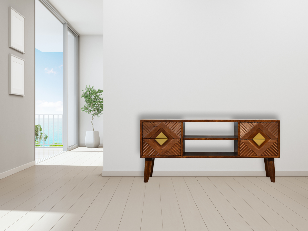 From the sleek silhouette to the intricate, hand-finished details, every aspect speaks volumes about the quality embedded in this media unit. The chestnut finish is not simply a color choice, but the result of meticulous craftsmanship that brings out the intricate patterns and natural allure of the mango wood. Each diamond-shaped brass inlay is precision-placed to create a stunning visual effect that catches the light and the eyes.