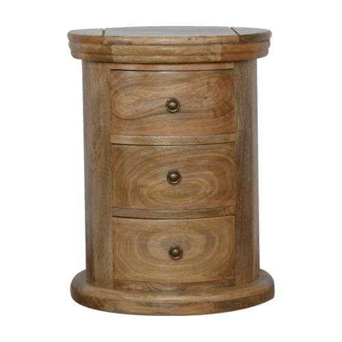 The construction process of the Granary 3 Drawer Drum involves meticulous attention to detail. Artisans carefully select the finest pieces of solid mango wood for their durability and aesthetic appeal. The wood is then skillfully worked into a smooth, drum-shaped form that is both eye-catching and practical.