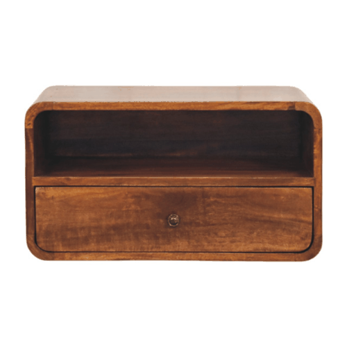 Discover the perfect blend of modern minimalism and timeless craftsmanship with the Avora Wall-Mounted Chestnut Nightstand. Expertly handcrafted from 100% solid mango wood, this exquisite piece showcases a rich chestnut finish that adds a warm, earthy tone to any bedroom or living space. Its sleek, curved design exudes elegance while maximizing functionality, making it an ideal choice for contemporary interiors seeking sophistication and practicality.