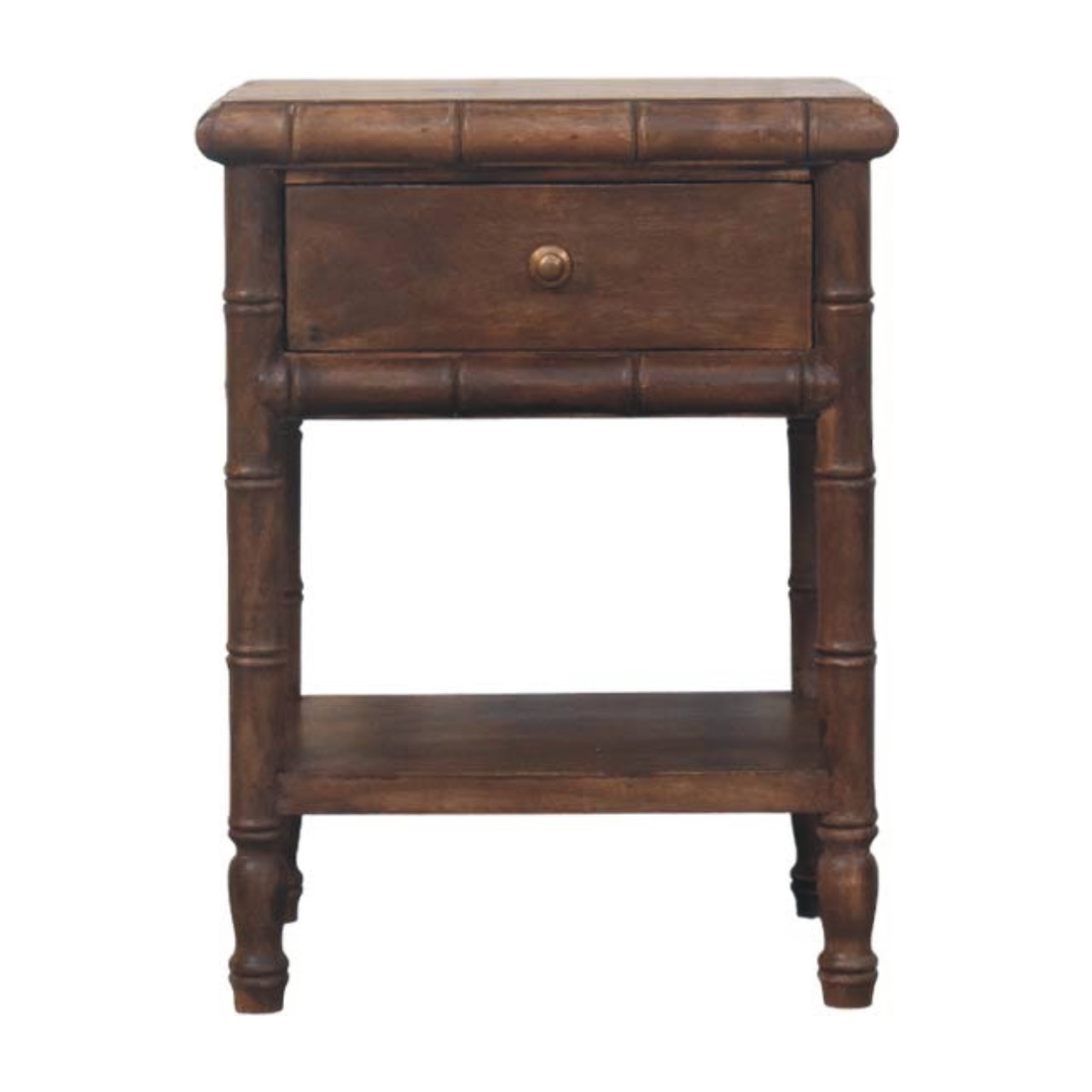 Functionality is key to the Bamboo Carved Bedside Table’s appeal. The design includes a single drawer adorned with an antique brass knob, providing a discreet area to store personal items, thus keeping your space tidy and organized. Below, an open shelf offers additional storage or display space, perfect for books, plants, or decor accents, allowing you to personalize your space effortlessly.
