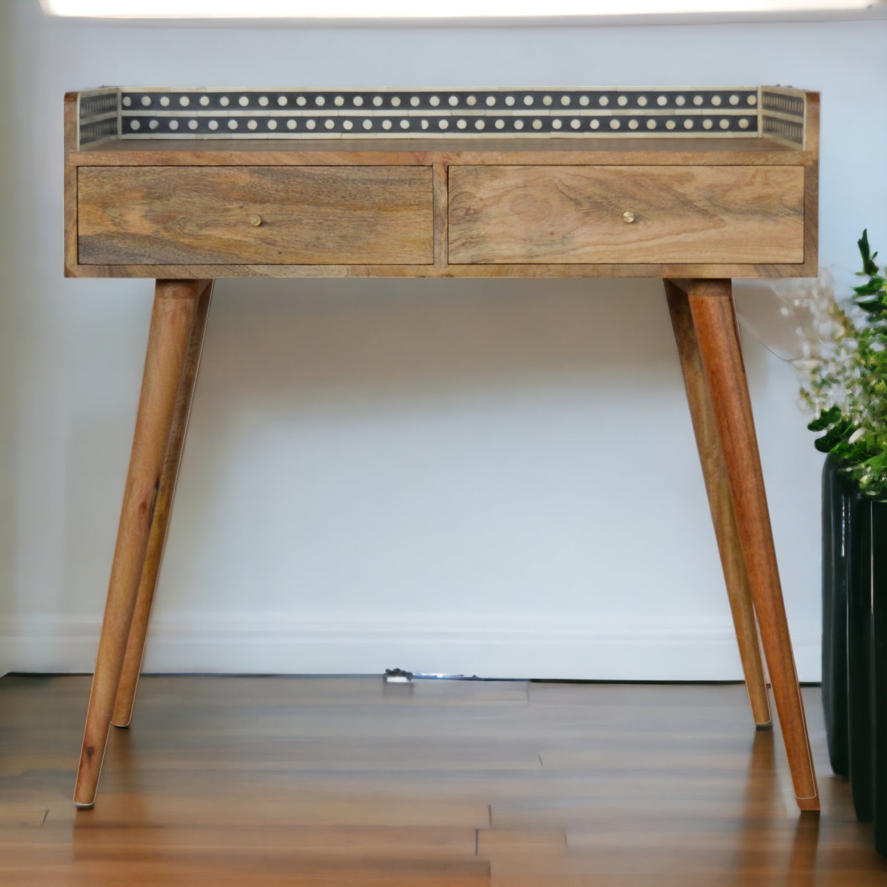 Introducing the Bone Inlay Gallery Console, a stunning piece of furniture that perfectly encapsulates the synthesis of traditional artistry and contemporary design. This exquisite solid wood console table is more than just a practical addition to your home; it’s a statement of refined taste and appreciation for the meticulous work of skilled artisans. Constructed from 100% solid mango wood and finished in a rich oak-ish hue, this console is a centerpiece that invites the warmth of nature and the intricacy of handcrafted design into your living space.