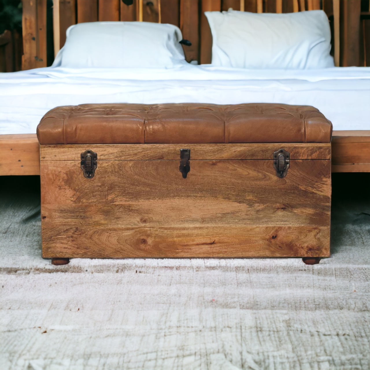 Envision your space transformed by the Buffalo Hide Oak-ish Storage Trunk, a versatile marvel that promises to be the centerpiece of conversations and an exemplar of plush elegance. Imagine the trunk welcoming you in your hallway, offering a comfortable perch as you slip off your shoes, or adding an air of distinction to your bedroom, waiting to cradle your linens and pillows. The buffalo hide leather, rich in texture, beckons one to caress its surface, while the solid mango wood foundation ensures stability and strength—a combination of natural beauty and human ingenuity.
