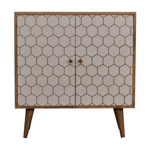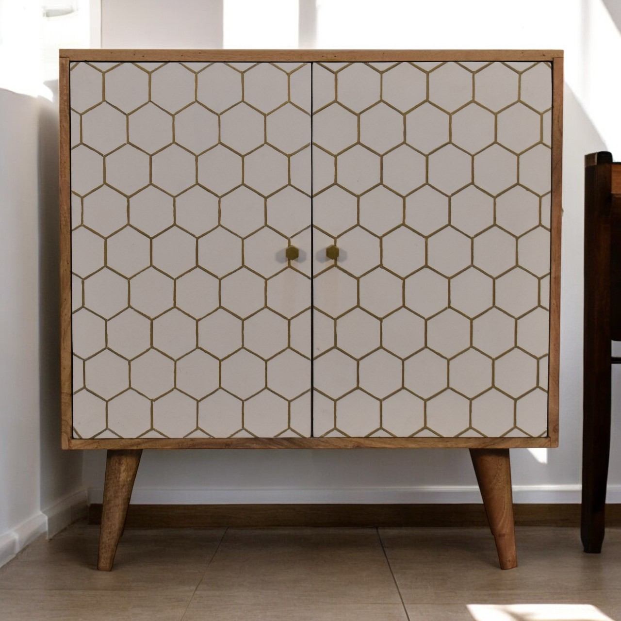 For those who appreciate the beauty of artful design, the Cassia Cabinet offers exquisite hand-painted white door fronts. These doors are adorned with a brass honeycomb inlay pattern that catches the eye and captivates the senses, infusing the space with a serene yet sophisticated flair. The pattern is not purely decorative; it symbolizes the attention to detail and artistic talent that goes into every cabinet, offering a tableau that is as engaging as it is elegant.