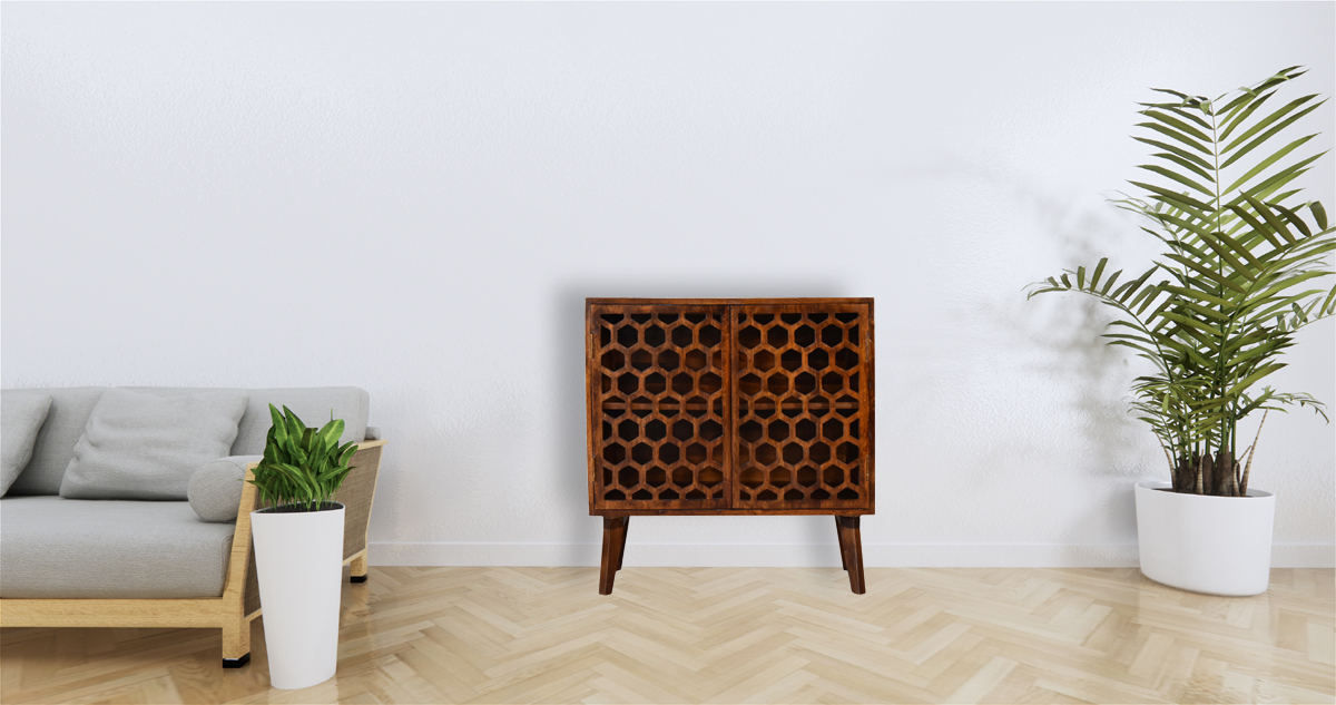 Want to add a stunning contemporary vibe to your home, look no further than the Chestnut Comb Cabinet it has been constructed from 100% solid mango wood in a chestnut finish it features 2 open carved door fronts. It features a large shelf inside and stands on 4 Nordic-style legs, a great statement piece for the living room