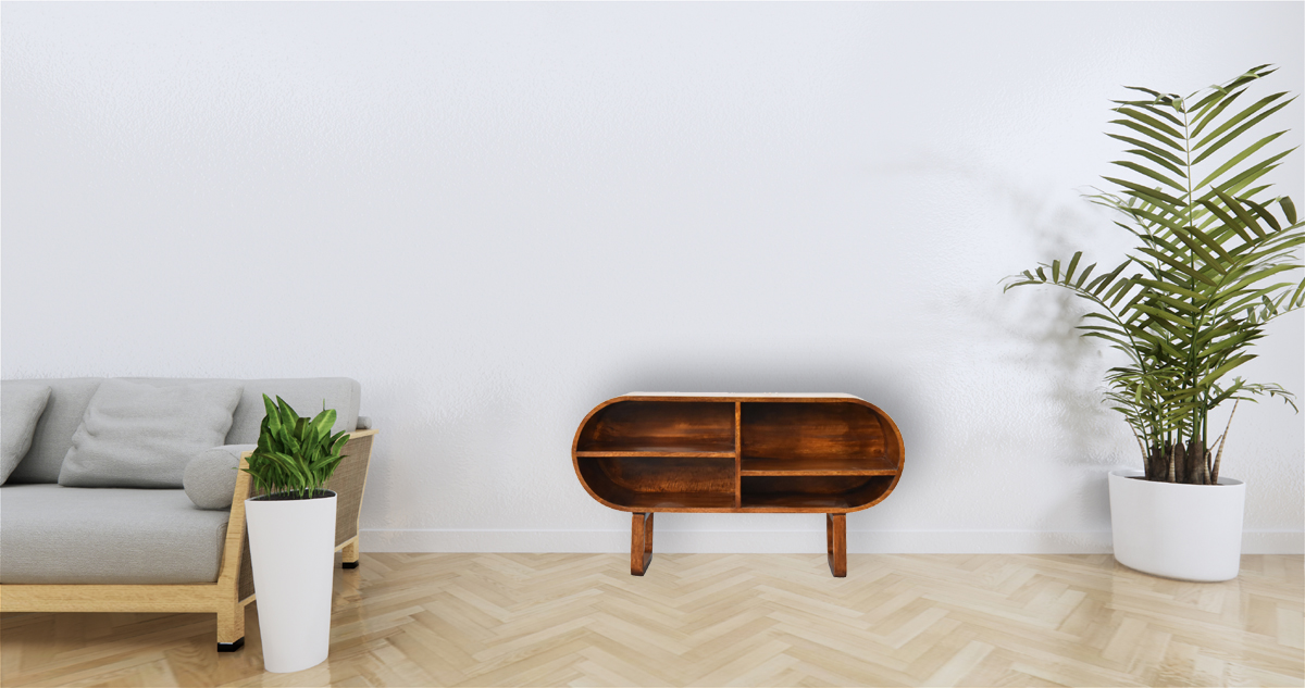 This round style media unit has been constructed from 100% solid mango wood in chestnut finish. It features 2 open slots and 2 drawers which provide great storage and will come in handy in the living room. Some other features include 4 Nordic style legs and shiny knobs on the drawers. It can be used alone or be partnered with the other rounded furniture pieces from the collection.