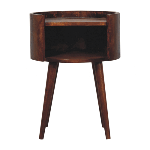 This round style bedside has been constructed from 100% solid mango wood and has an open design, perfect for stroring or displaying any bits and pieces before bedtime. It has been constructed from 100% solid mango wood in a chestnut finish allowing its simple design to be able to be partnered with any styles or finishes of furniture.