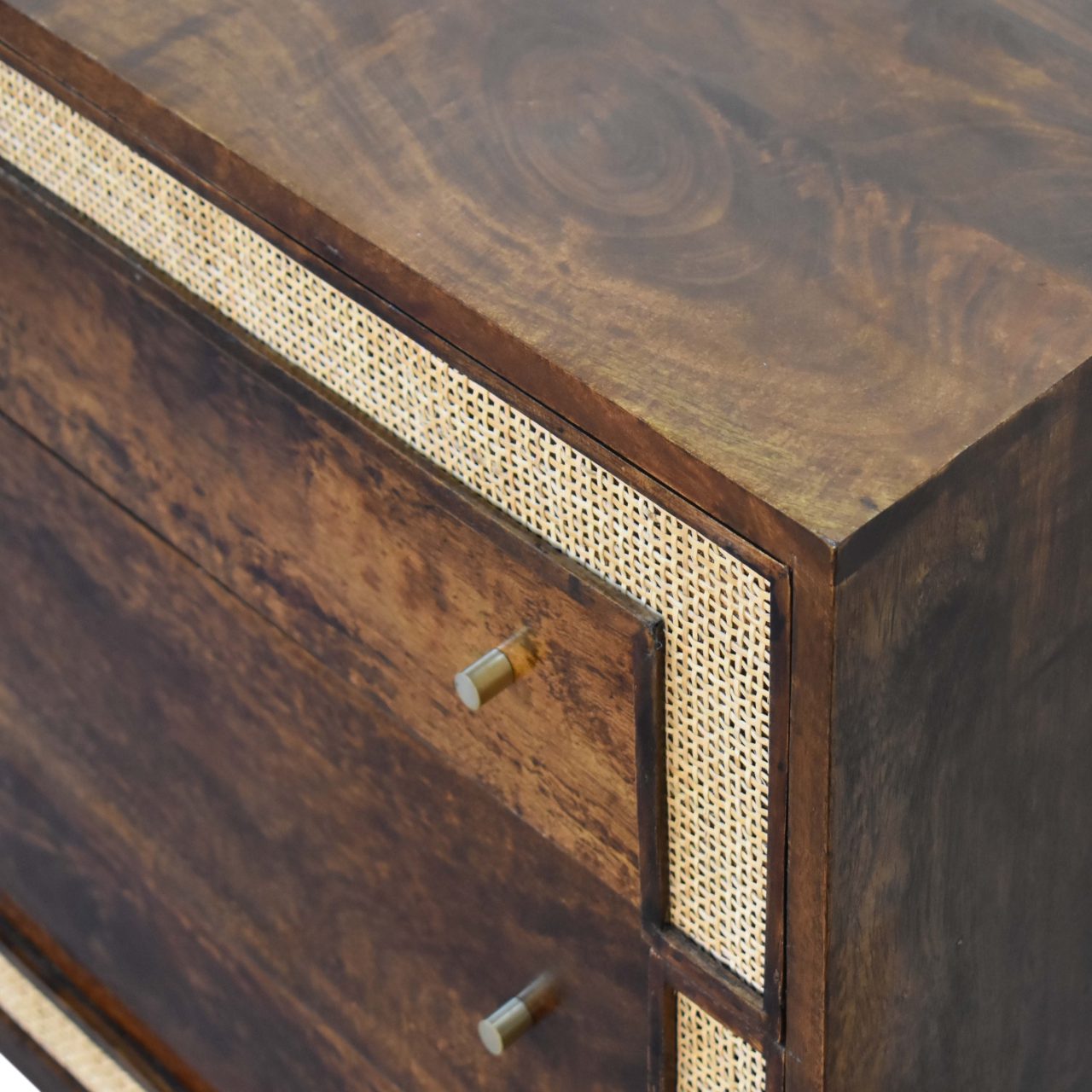 The woven design encircles each drawer, offering an intriguing textural contrast that elevates the chest’s visual appeal. The intricacy of the woven detailing reflects the skilled craftsmanship involved in creating this piece. Each element, from the sturdy construction to the fine finishing touches, showcases a commitment to quality and artistry.