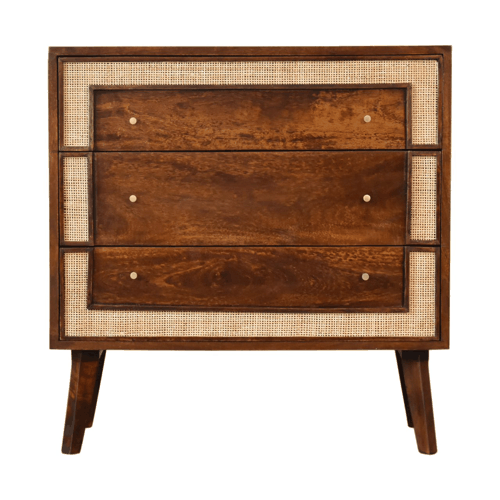 This stylish Chestnut Woven Chest combines smooth chestnut drawers and legs, surrounded by a light woven design giving the piece a beautiful contrast. Constructed from 100% solid mango legs it features 3 spacious drawers perfect for storage, shiny knobs on the drawers, and nordic style legs. Make full use of this chest in your bedroom and partner it with the rest of the collection.