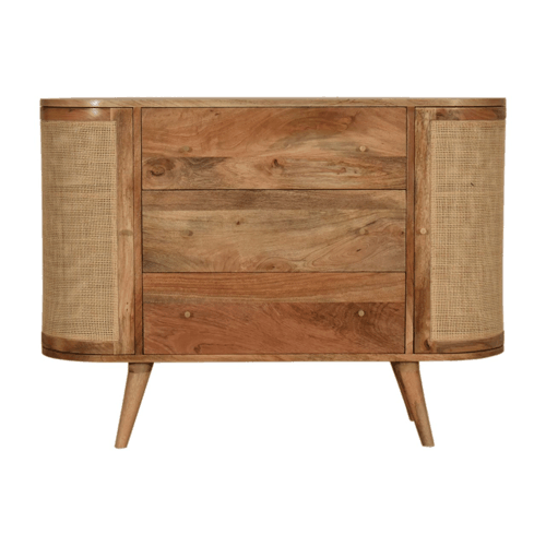 The body of the cabinet, with its oak-ish finish, exudes warmth and comfort, inviting you to incorporate it as a focal point in your living room or as a statement piece in your bedroom. The carefully woven door fronts add a textural element that captivates and draws in the admirer, creating intrigue and a sense of handcrafted luxury. The Nordic-style legs provide stability and a nod to minimalist design, ensuring the cabinet doesn’t overpower your existing décor but rather enhances it with its gentle charisma.