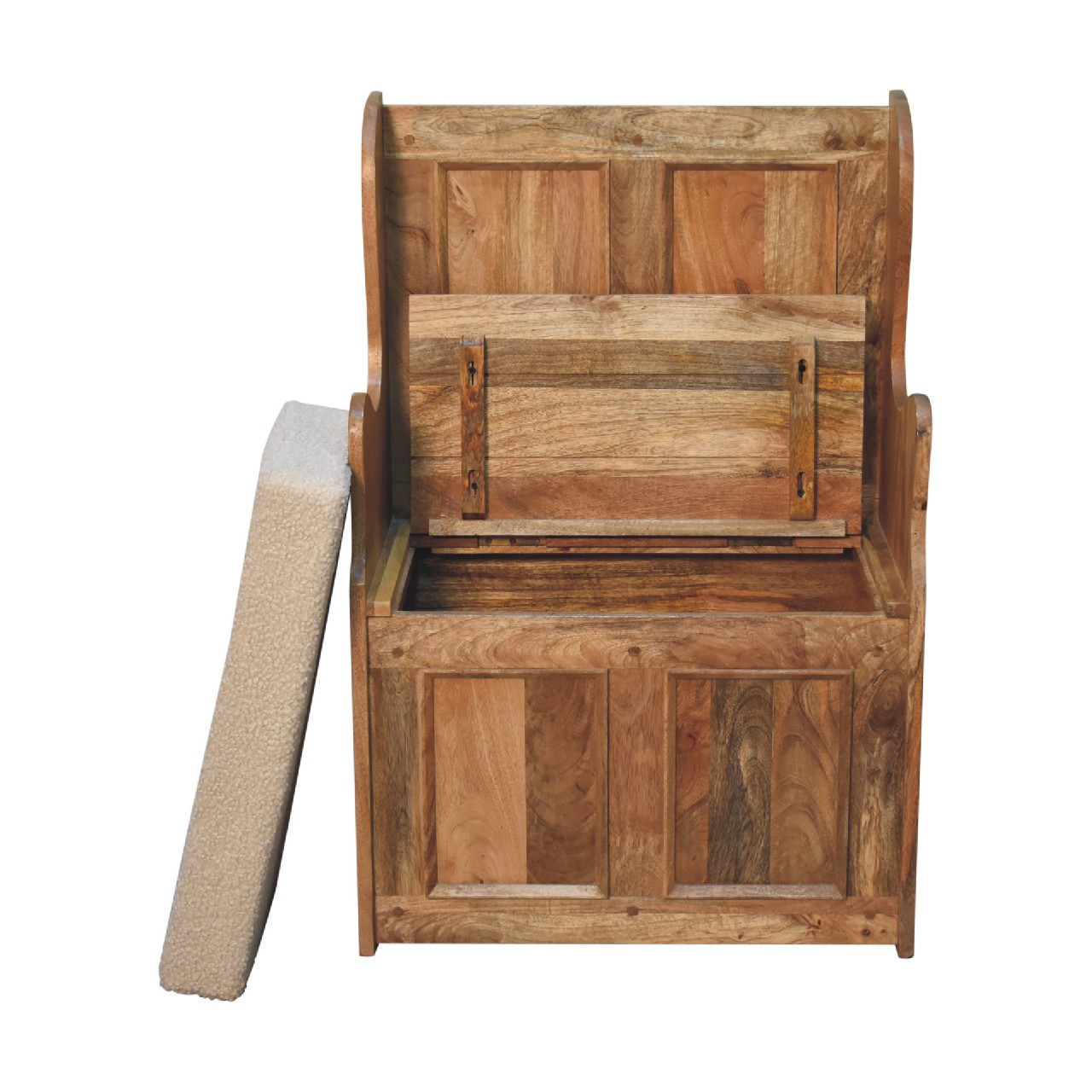 Our Small Monks Storage Bench is a practical and stylish solution for smaller hallways. Handmade from solid mango wood in an oak-ish finish, it features exquisite carved sides and intricate panel detailing. With ample storage space inside, this country-style bench provides convenience without taking up too much space. The cream boucle seat adds a touch of elegance to complete the look.
