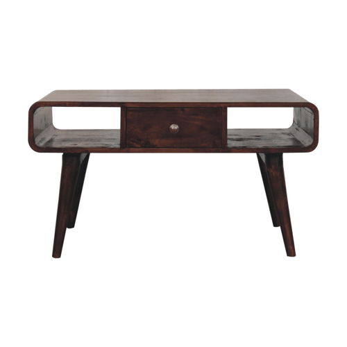 Immerse yourself in the delightful sophistication of the Curved California Walnut Coffee Table, an exquisite addition that brings a touch of elegance and practicality to any home. Perfectly crafted from 100% solid mango wood, this coffee table features a rich California walnut finish that embodies both modern sensibilities and timeless warmth, making it a striking yet versatile piece suitable for a variety of interior styles.