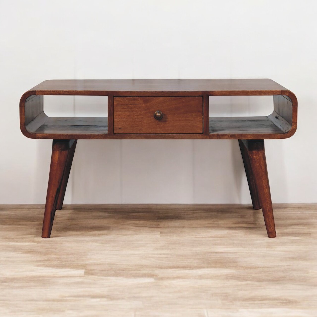 This Coffee Table offers clean, curved edges and has been constructed from 100% Solid Mango Wood in a rich, honey caramel finish. Some features include 2 drawers that have a shiny knob, 2 open slots to place any books, photo frames or ornaments and stands on 4 Nordic style legs.