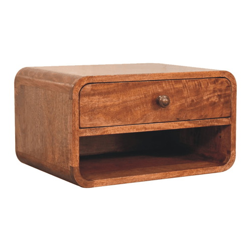 Discover the perfect blend of elegance and functionality with the Curved Honey Caramel Wall Mounted Bedside. This minimalist masterpiece, inspired by our distinctive curved range, is crafted to transform your bedroom into a serene sanctuary. Constructed from 100% solid mango wood, renowned for its durability and beauty, this unit is not merely a piece of furniture but a statement of style and sophistication.