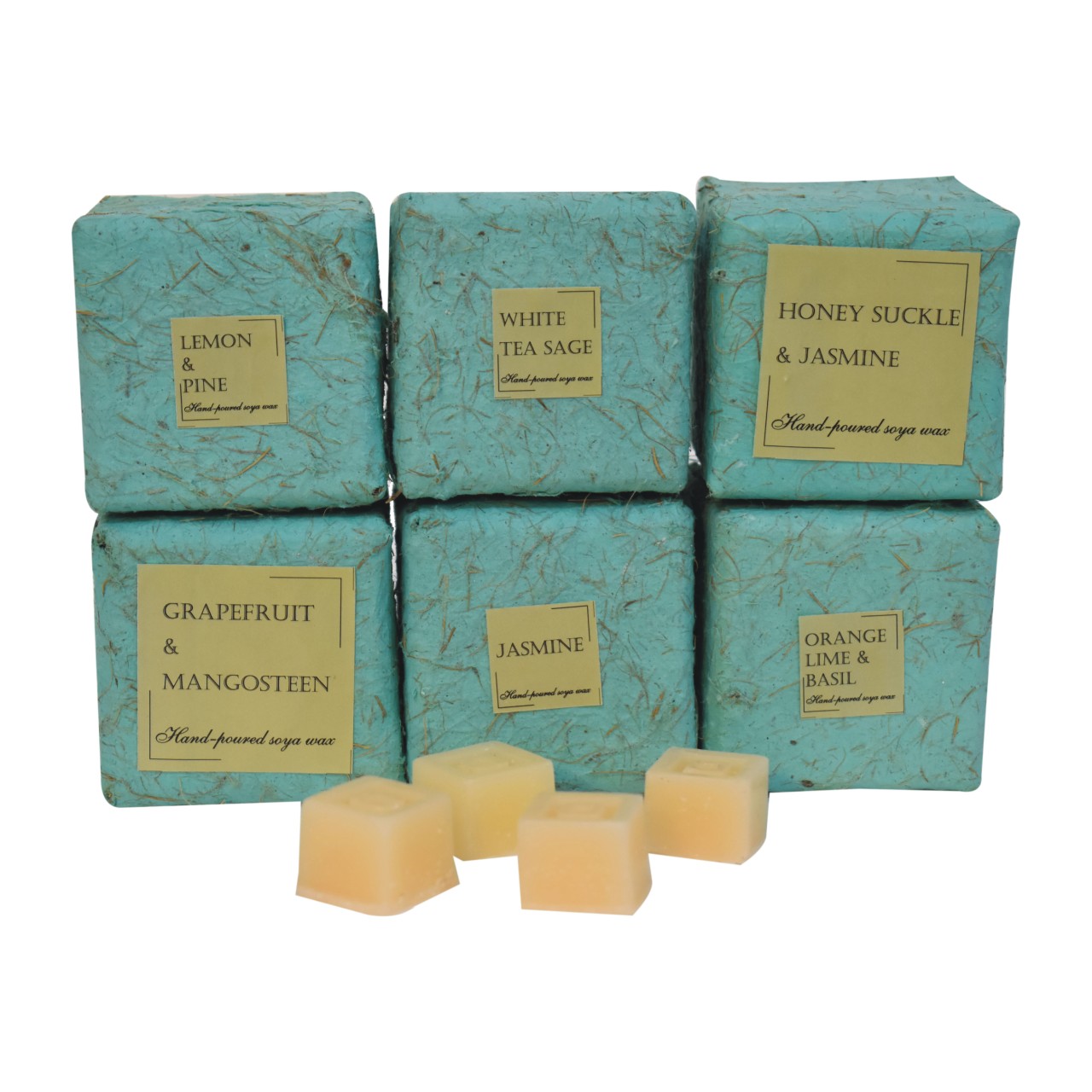 - 1x Wax melter + 4 x 6 Fragrances wax melts + 12 x Unscented Tealight candles