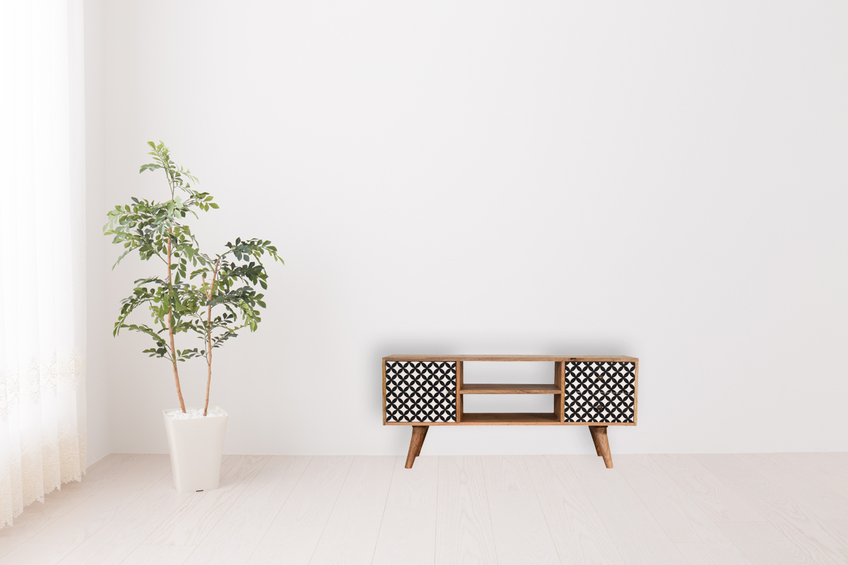 This media unit has been constructed from 100% solid mango wood and finished in a fine oak-ish finish body. The main features of this piece are the screen printed door and drawer fronts which have a beautiful, diamond design giving the piece extra dimension and character. Useful storage is provided with all 2 open slots and drawers to discreetly store any bits and pieces. It also has 4 Nordic-style legs and 4 shiny knobs.