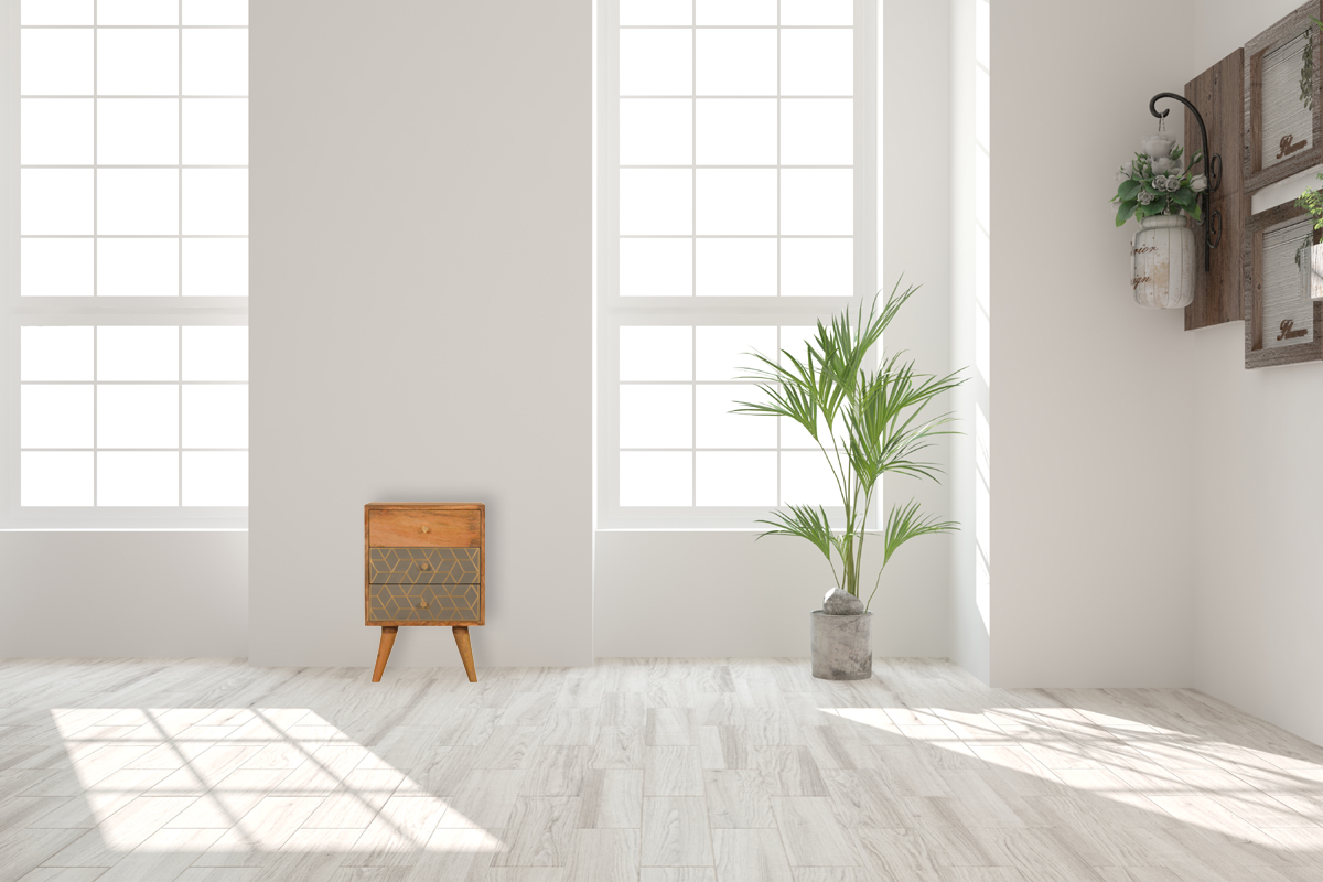This bedside has been inspired by a clean and modern design. It has been constructed from 100% solid mango wood in an oak-ish finish and features 2 gold dice patterned drawers which blend beautifully with the grain pattern of the wood. Other features include nordic style legs and shiny brass knobs.