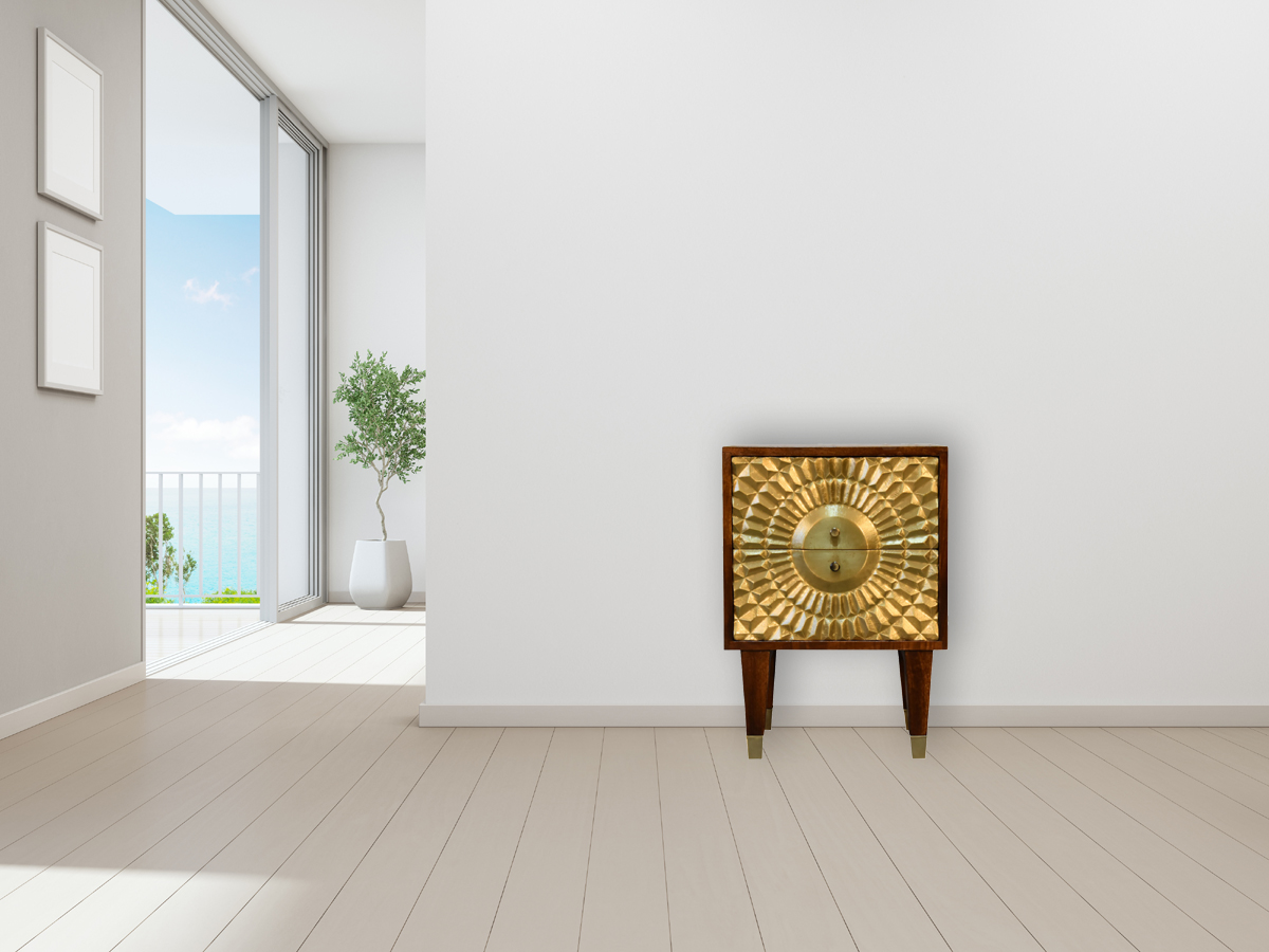 This Eden Bedside is made of solid mango wood, with a chestnut finish structure. It has 2 spacious drawers for convenient storage space and ample space on top to display a photo frame, candle or lamp. Additionally, the exquisite craftsmanship and beautiful gold brass sheet provide a beautiful carved pattern on the drawer fronts making this an all-round eye-catching piece of furniture in your bedroom