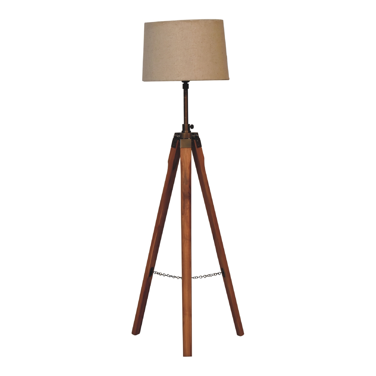 The Fixed Brass Tripod Floor Lamp stands as a testament to fine craftsmanship and design innovation. The teak wood base, known for its robustness and natural aesthetic appeal, forms a sturdy tripod structure. This wooden base is complemented by a fixed brass component, lending a touch of elegance and sophistication to the overall design. The durability of teak wood and the timeless appeal of brass ensure that this lamp is not only beautiful but also built to last.