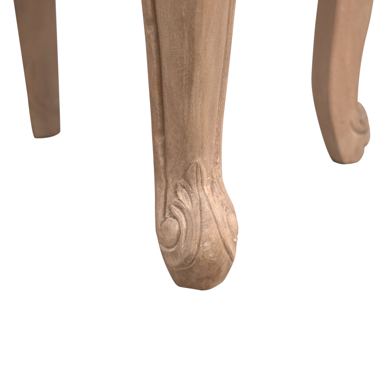 This accent chair is constructed from 100% solid mango wood, known for its robust nature and beautiful grain patterns. The fine craftsmanship is evident in every curve and contour of the chair, particularly its four French-styled cabriolet legs. These legs not only serve a functional purpose but also add a distinctive ornate touch, elevating the chair’s visual appeal. Finished with a sun-bleached effect, the legs enhance the vintage look while lending a soft, warm hue that complements a variety of interior styles.