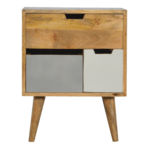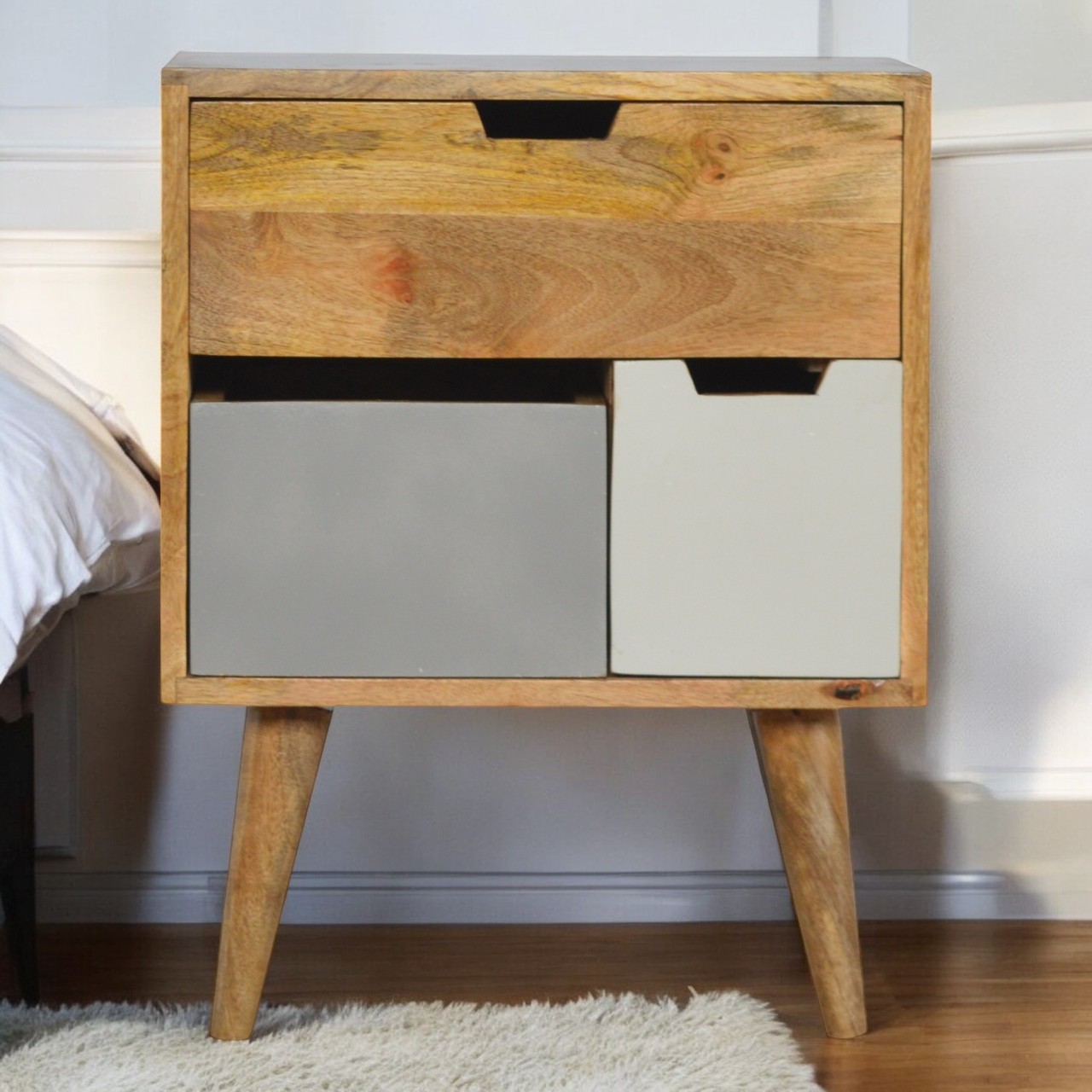 Nestled within its compact frame is a medley of storage options: one solid wood drawer, exquisitely carved without handles to present a seamless facade that speaks volumes of its understated elegance. Accompanying this central feature are two additional drawers that boast an artistic gray gradient, meticulously hand-painted to instantly draw the eye and kindle the imagination. These drawers are not just receptacles for your cherished items but are also entirely removable, empowering you to switch their order and revitalize your space on a whim, injecting a dash of freshness whenever desired.