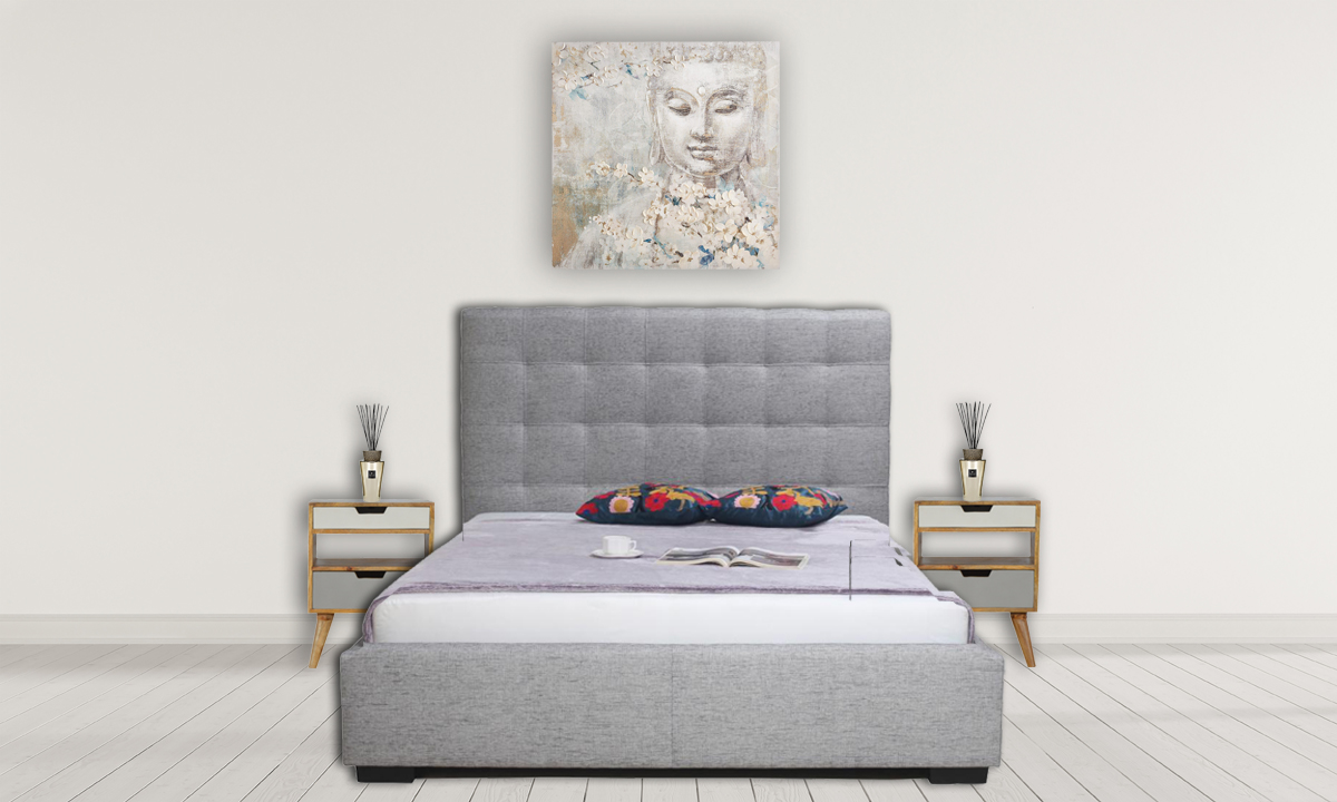 Featuring two hand-painted drawers exuding an ethereal grey and white gradient, this bedside table provides an ample and accessible storage solution for your reading glasses, favorite novels, or personal mementos. The cut-out handles seamlessly integrate with the minimalist facade, offering a tactile experience both convenient and aesthetically pleasing. The middle shelf beckons with additional space—a perfect alcove for your current reads or artistic displays that personalize your sleeping domain.