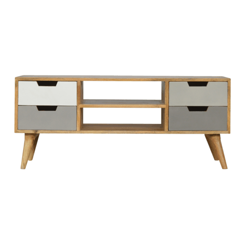 The Grey Painted Open TV Unit is more than a mere television stand; it embodies the essence of modern living, offering a sleek stage for your flat-screen TV and a harmonious platform that complements your interior aesthetic. With a smooth, oak-ish finish that captures the raw beauty of mango wood, the unit is further enhanced with drawers hand painted in subtle dual tones of grey. This gradient effect not only adds a touch of elegance but also introduces a visually captivating element to your living space.