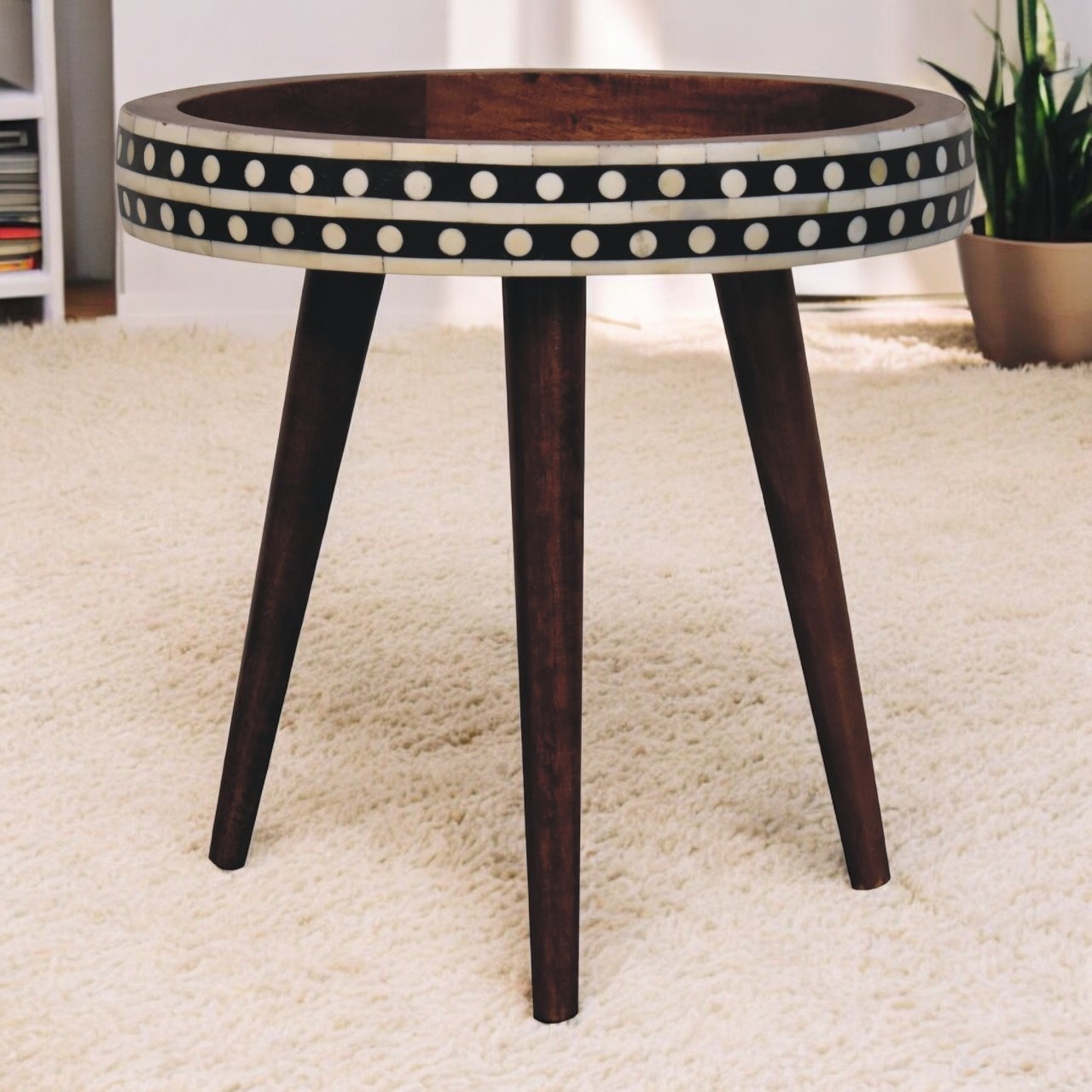 Embrace the harmonious blend of contemporary design and traditional craftsmanship with the Honey Caramel Small Patterned Nordic Style End Table. Expertly crafted from 100% solid mango wood, this exquisite piece features a sumptuous honey caramel finish that highlights the natural beauty and grain of the wood. The minimalistic design of the Nordic-style tripod legs pairs seamlessly with the intricate black and white bone inlay pattern encircling the table’s edge. Sourced ethically from deceased animals such as camels, goats, and buffaloes, the bone inlay adds an element of sophistication and artistry, making this end table a stunning focal point in any space.