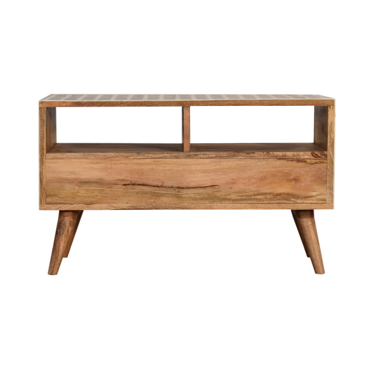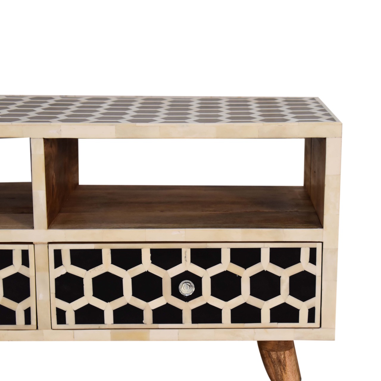 This media unit has a clean and simple design to suit most homes. This piece has a lovely oak-ish finish and features 2 bone inlay drawer fronts which have a honeycomb pattern and 2 glass knobs. It provides 2 open slots and 2 drawers for extra storage. Some other features 4 Scandinavian style legs.
