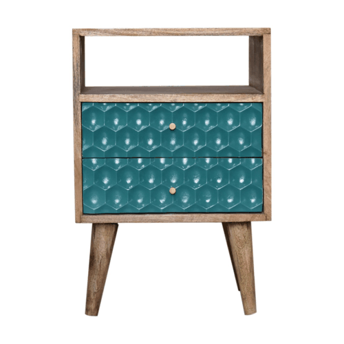 This stunning hand-carved honeycomb bedside table will add a stylish and contemporary vibe to your home. Constructed from 100% solid mango wood in an oak-ish finish it features 2 teal hand-painted drawer fronts and 1 open slot for convenient storage. It stands on 4 Nordic-style legs and makes a great statement piece for the bedroom.