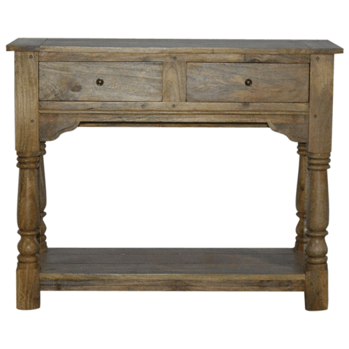 As you step through the doorway, the gentle oak-ish finish of the console beckons, inviting you into a home that values both aesthetics and order. Spanning over the length of this table is a shelf at the base, providing additional display space for your decorative baskets or books—forming an equilibrium of utility and allure. The charm of the Solid Mango 2 Drawer Console is further enhanced by its four exquisitely hand-turned legs, each telling a silent story of meticulous craftsmanship.