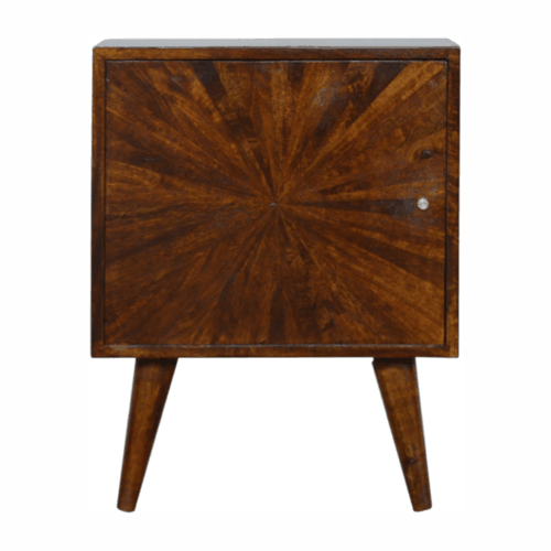 Introducing the Chestnut Sunrise Door Bedside Table – a testament to timeless beauty and serene functionality that promises to transform your bedroom into a sanctuary of rest and relaxation. With its distinct sunrise patterned door and rich chestnut finish, this bedside companion exudes a modern retro charm that beautifully complements any sleep space.