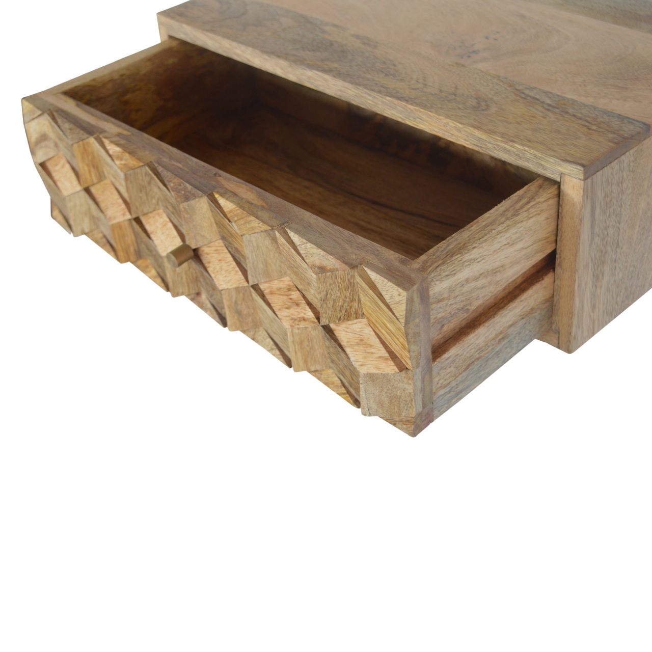 This minimalistic wall-mounted unit has been constructed from 100% solid mango wood in an oak-ish finish and features 1 cube carved drawer with a shiny knob. This piece is perfect for storing any bits and pieces you wish to keep close by before bedtime. Its neat and clean design can easily be mounted on the wall without the fuss of any legs. Caution! Do not sit on the unit.