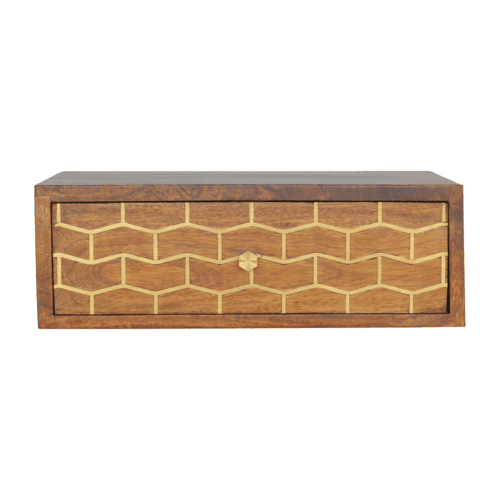 This minimalistic wall-mounted bedside has been constructed from 100% solid mango wood in a chestnut finish and features 1 brass inlay pattern drawer with a shiny knob. This piece is perfect for storing any bits and pieces you wish to keep close by before bedtime. Its neat and clean design can easily be mounted on the wall without the fuss of any legs. Caution! Do not sit on the unit.
