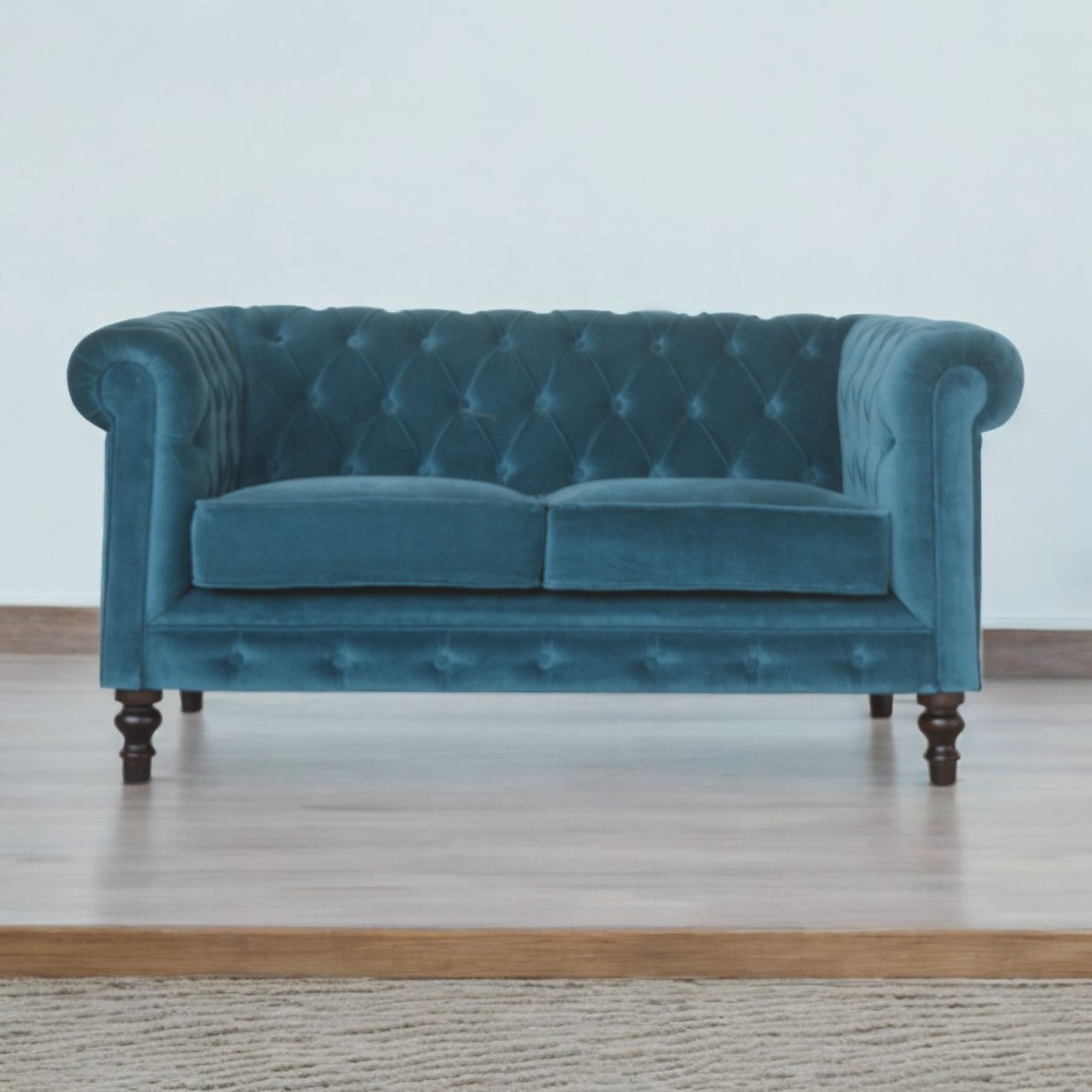 Enhance your home with the Teal Chesterfield Sofa, a beautiful 2-seater that embodies luxury and sophistication. Upholstered in alluring smooth teal cotton velvet, this sofa is not merely a piece of furniture but a statement of style. It features four delicately turned feet expertly crafted from 100% solid mango wood, finished in a rich walnut hue. The legs provide both stability and elegance, enhancing the overall aesthetics of the sofa.