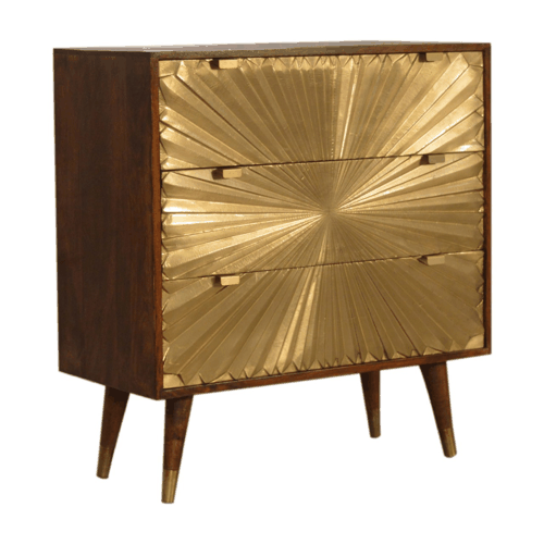 Expertly constructed from 100% solid mango wood, the Manila Gold Chest boasts durability and style in perfect harmony. The three brass-plated drawers offer ample storage space, ideal for keeping your belongings organized while adding a touch of extravagance to your interior décor. Each drawer front is intricately designed with a radiant sunburst pattern, creating an eye-catching visual appeal that is bound to draw compliments from your guests.