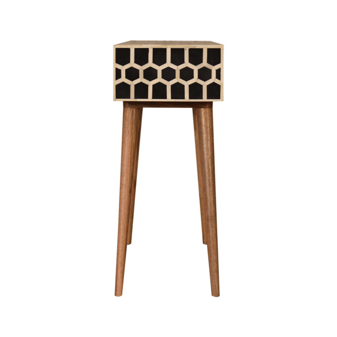 Discover a perfect blend of sleek design and intricate artistry with the Honeycomb Bone Inlay Console Table. Crafted to complement the modern household, this console table offers a minimalist allure tempered by the intricate honeycomb bone inlay that elevate its simple silhouette into a sophisticated statement piece. This console table fuses practicality with aesthetic charm, presenting an ideal surface for displaying your favorite items or organizing your essentials.