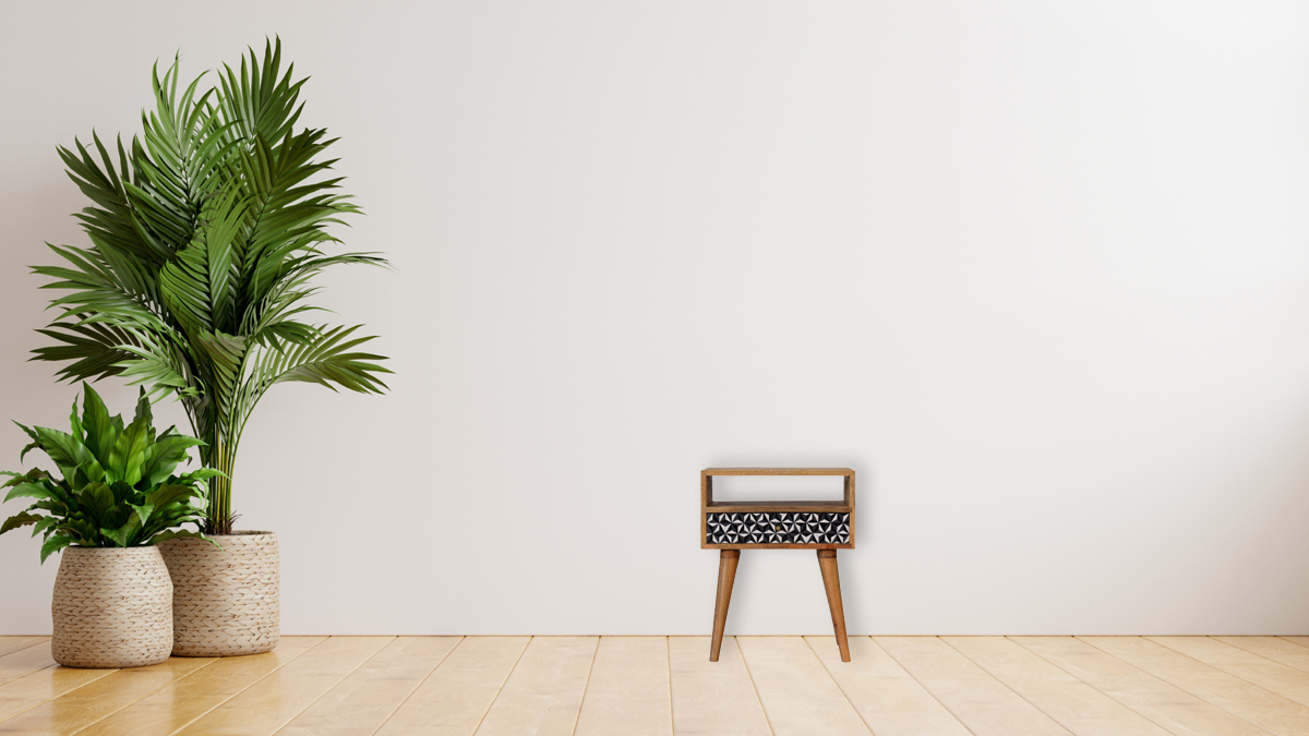 This bedside has been constructed from 100% solid mango wood and finished in a fine oak-ish finish body. It features a black and white pattern drawer front which is bound to uplit your bedroom and allow you to store any bits and pieces discreetly along with a open slot for extra stroage. It also has 4 Nordic style legs and ample space on top for a lamp, photo frames or ornaments.