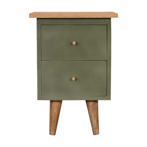 Elevate the aesthetic of your bedroom with the stunning Olive Hand Painted Bedside. This beautifully crafted piece of furniture blends classic design with modern functionality to create an exquisite addition to your living space. Made from 100% solid mango wood, the bedside table showcases the perfect synthesis of durability and elegance. The oak-like finish of the top surface complements the hand-painted olive green body, evoking a sense of timeless appeal that is sure to captivate attention and add a splash of color to your room.