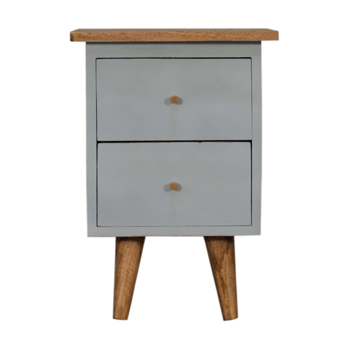 Beyond its stunning appearance, this bedside is a paragon of craftsmanship—shaped, sanded, and finished by the skilled hands of artisan woodworkers. The unique oak-ish finish top converges with the vibrant sky blue body, each brushstroke capturing the passion and precision necessary to bring such a piece to life. It is effortlessly versatile, ready to blend into an array of decor styles, while also standing out as a statement piece that draws the eye with its alluring vibrancy.