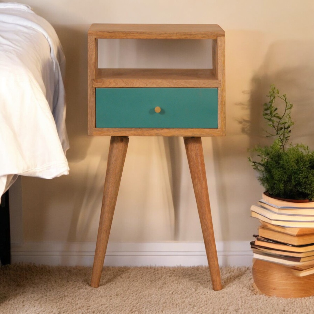 Constructed from 100% solid mango wood, this bedside table is built to last, ensuring a lasting addition to your furniture repertoire. The wood’s rich grain is beautifully showcased in the top’s oak-ish finish, which provides a smooth canvas to complement your favorite lamp, book, or accessory. Supported by elegant Nordic style legs, the table stands with a confident poise that harmonizes with diverse interior styles from mid-century modern to the cozy farmhouse.