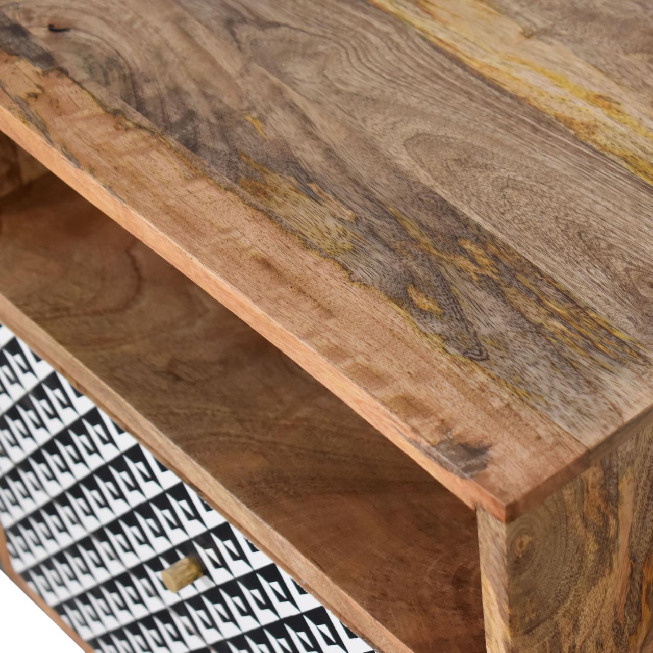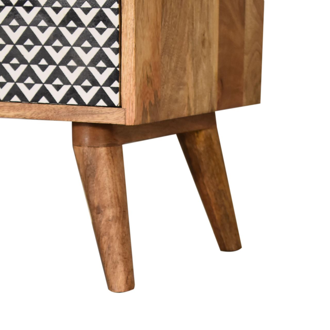 This bedside has been constructed from 100% solid mango wood and finished in a fine oak-ish finish body. The 2 drawers feature a black and white pattern which is bound to uplit your bedroom and allow you to store any bits and pieces discreetly. It also has 4 Nordic style legs and ample space on top for a lamp, photo frames or ornaments.