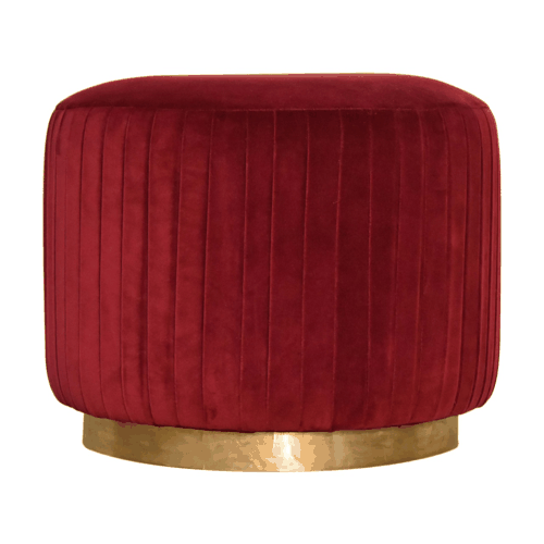 This beautiful and fashionable design will make the perfect addition to any bedroom or living room. This footstool has been upholstered in a luxurious wine red cotton velvet fabric with a pleated design featuring a gold base. Perfect for putting your feet up, using as a handbag stand or as an accent piece in the home.