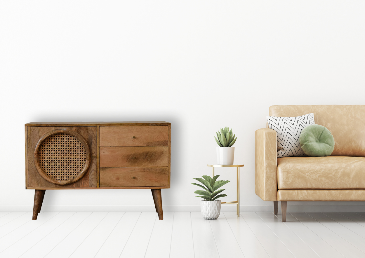 Handmade Indian furniture showcases the exquisite craftsmanship of local artisans. Our Larissa Sideboard, with every unique rattan weave and wood finish, exemplifies this rich tradition. With careful hands and generations of woodworking knowledge, each sideboard celebrates not only the junction of style and storage but also the dedication and skill of its creators. The individually crafted rattan patterns and natural wood grains mean that each piece bears a signature of authenticity and bespoke charm, unfound in mass-produced items.