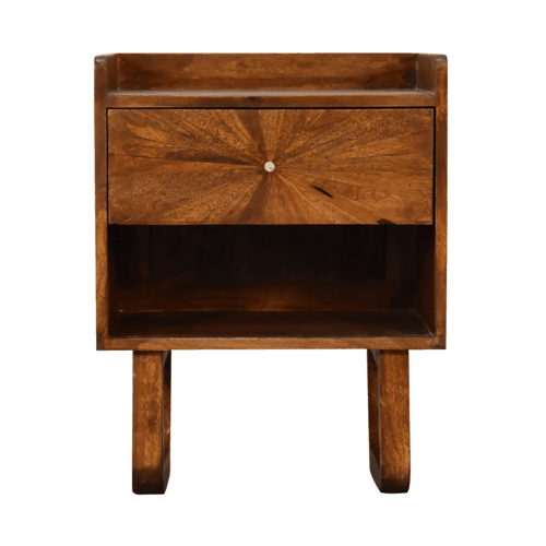 The U-Chestnut Sunrise Open Bedside narrates the story of traditional woodworking artistry, as each bedside is handcrafted to perfection by local artisans who pour their soul into every piece. Their refined skills, passed down through generations, manifest in the intricacies of the sunrise design and the impeccable finish that celebrates the natural patterns of mango wood. It’s more than furniture; it’s an artisanal piece that pays homage to India’s vibrant culture, where each groove and curve whispers the tales of the craftsman’s heritage and devotion.