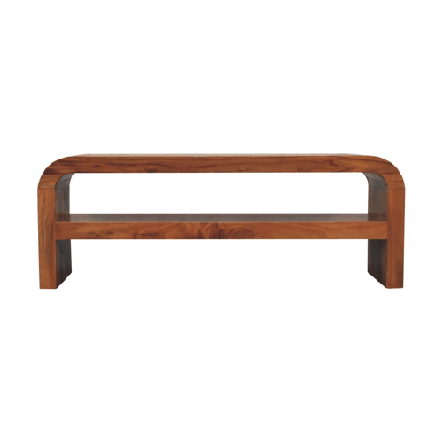 The sleek design of the Darcy Media Unit highlights contemporary elegance. The curvaceous corners add a soft touch to its sturdy construction, making it a seamless fit for a variety of interior styles, from modern to traditional. The warm caramel finish accentuates the natural grains and textures of the acacia wood, providing visual delight and a warm, welcoming aura to any room. With generous dimensions, it offers ample space for your media accessories while serving as a stylish platform for your television or entertainment system.